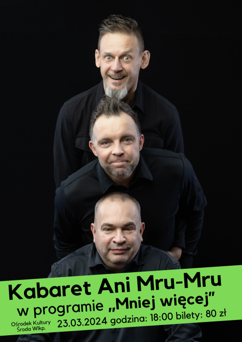 Serdecznie zapraszamy na występ kabaretu Ani Mru-Mru w premierowym programie „Mniej więcej”. Przygotujcie się na niezapomniany wieczór pełen humoru i wyrafinowanych skeczy. Bilety w cenie od 80 zł. do nabycia w sekretariacie Ośrodka Kultury oraz online na www.bilety24.pl