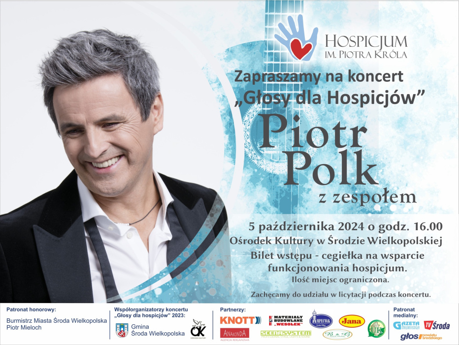 Przed nami kolejne wspaniałe wydarzenie – koncert charytatywny w ramach inicjatywy "Głosy dla Hospicjum", który odbędzie się 5 października o godzinie 16.00 w Ośrodku Kultury w Środzie Wielkopolskiej. Nieprzerwanie wspieramy nasze średzkie Hospicjum im. Piotra Króla. W programie licytacja i uczta muzyczna w wykonaniu Piotra Polka z zespołem.