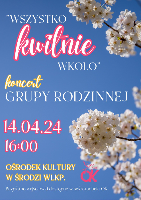 Zapraszamy serdecznie na wiosenny koncert Grupy Rodzinnej "Wszystko kwitnie wkoło", który odbędzie się 14 kwietnia 2024 roku w Ośrodku Kultury.