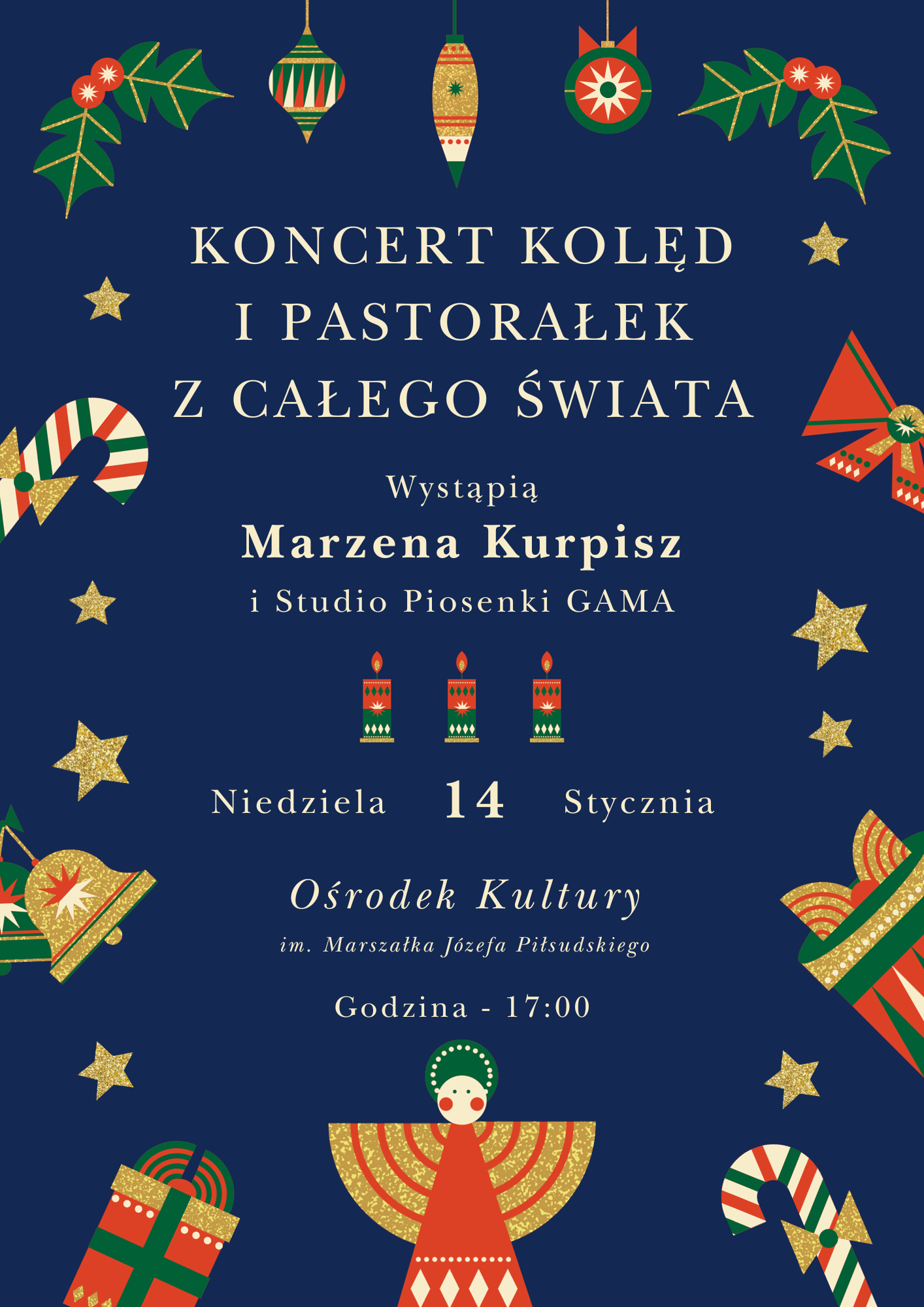 Mamy przyjemność zaprosić na wyjątkowy „Koncert kolęd i pastorałek z całego świata”. Na deskach naszej sceny wystąpi Marzena Kurpisz a towarzyszyć jej będzie Studio Piosenki GAMA. Usłyszymy utwory, te które są klasyką jak i te współczesne, niektóre aranżacje mogą zaskakiwać.