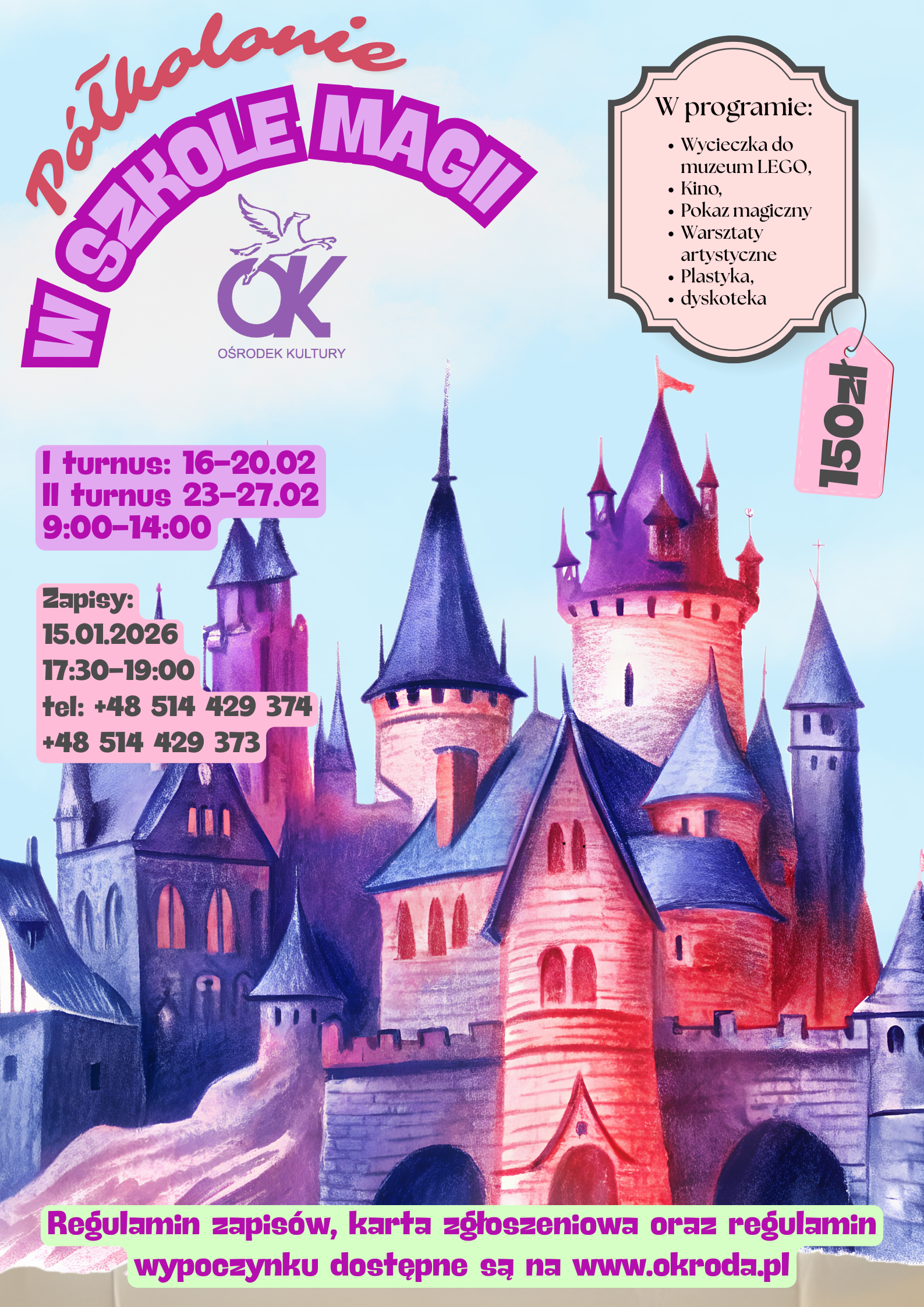 6.Warunkiem uczestnictwa w półkoloniach jest dostarczenie wypełnionej, podpisanej karty, podpisanego regulaminu i potwierdzenia wpłaty, do sekretariatu Ośrodka Kultury w Środzie Wielkopolskiej w nieprzekraczalnym terminie do dnia 23 stycznia 2026r.