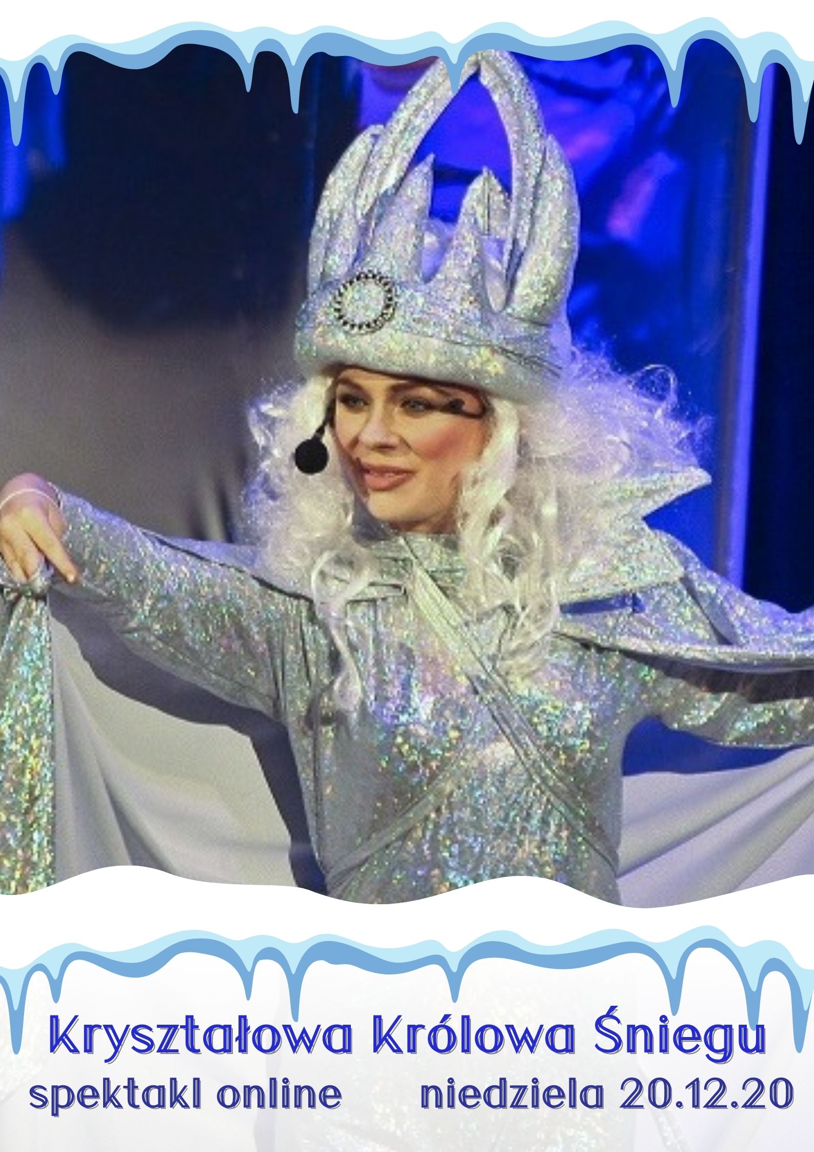 Kochane dzieciaki! Mamy dla Was fantastyczną wiadomość... W najbliższą niedzielę (20.12.20) za pośrednictwem naszej strony Facebook będziecie mogli obejrzeć przepiękny spektakl muzyczny KRYSZTAŁOWA KRÓLOWA ŚNIEGU. Przedstawienie będzie dostępne przez cały tydzień i na pewno umili Wam przedświąteczny czas.