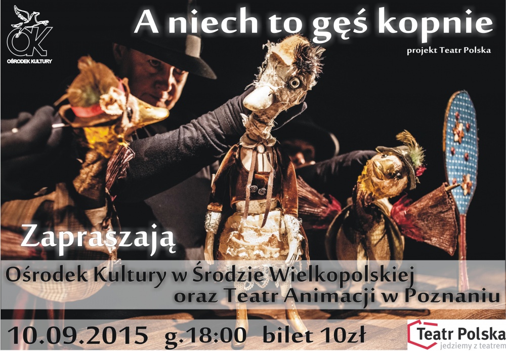 Któż z nas nie widział gęsi przechadzającej się beztrosko po wiejskim podwórku? Długaśna szyja, śmieszne, klapiaste stopy – gęś jak to gęś. Ale czy naprawdę ją znamy? Czy zastanawialiśmy się kiedyś, o czym myśli, o czym marzy? Twórcy spektaklu „A niech to Gęś kopnie!” zadali sobie te pytania i ku wielkiemu zdziwieniu odkryli smutną prawdę: Gęś – przynajmniej ich bohaterka – ma depresję. Jest chuda, brzydka i nie ma przyjaciół. Jedyne, co ma, to wielki smutek przyczepiony do niej mocno, niczym jesienny liść do podeszwy mokrego buta. A może Lis, który znienacka pojawi się w kurniku, pomoże bohaterce na nowo spojrzeć na świat?