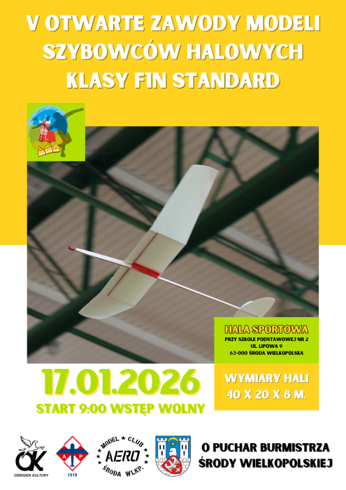 Wszystkich Miłośników Lotnictwa zapraszamy na kolejną już V edycję Otwartych Zawodów Modeli Szybowców Halowych klasy F1N Standard, które odbędą się 17 stycznia 2026 roku. Wydarzenie odbędzie się w hali sportowej przy Szkole Podstawowej nr 2 przy ulicy Lipowej 9 w Środzie Wielkopolskiej.