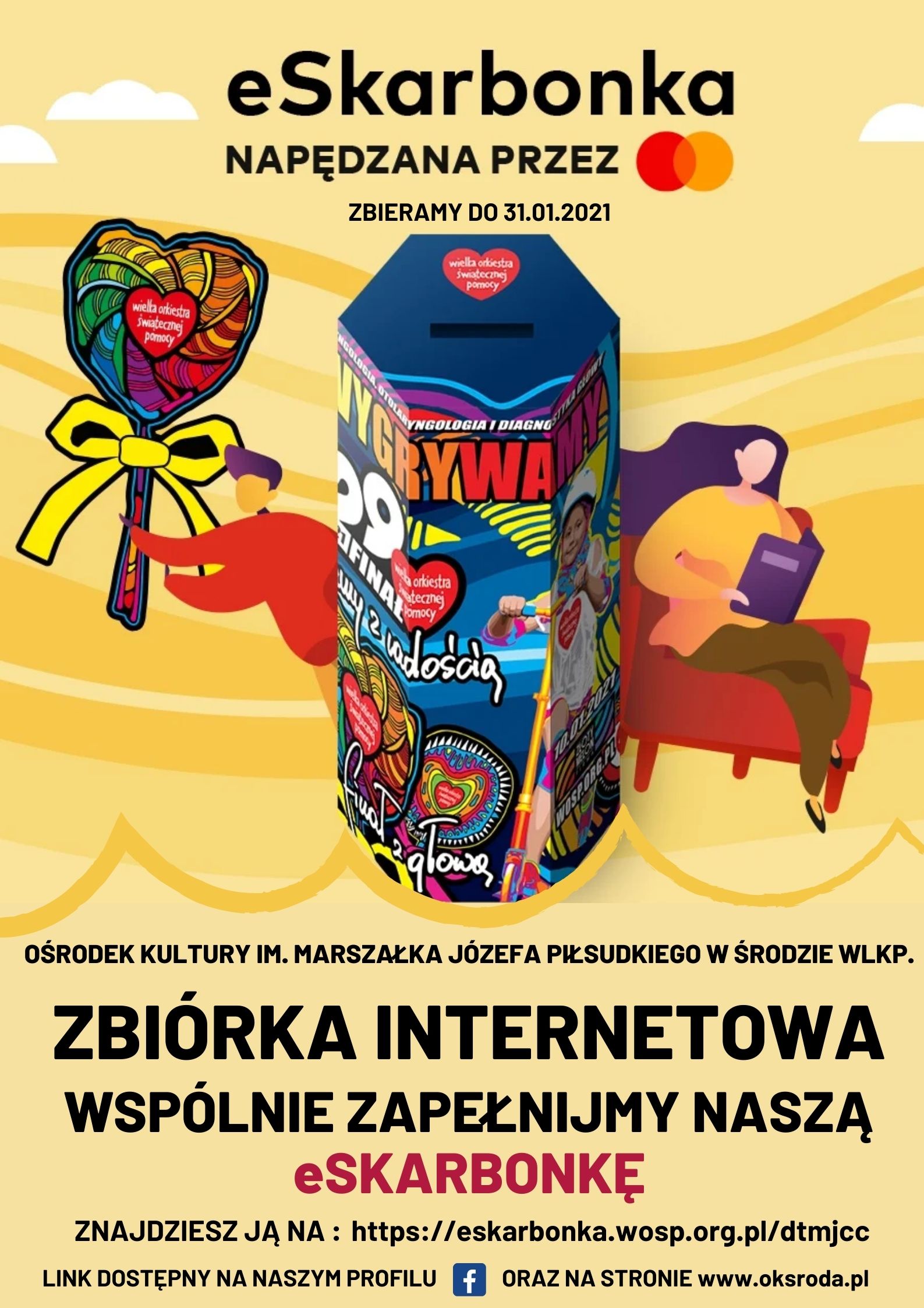 Ten rok jest inny...o tym nie trzeba nikomu przypominać, inny będzie też tegoroczny finał WOŚP, który zbliża się wielkimi krokami. Jest nam bardzo przykro, że Ośrodek Kultury ze względu na obecną sytuację nie będzie sztabem 29. Finału, dlatego uruchomiliśmy dla Was eSkarbonkę, dzięki której możecie przyłączyć się do zbiórki. Niech Środa pokaże, co potrafi! Link do skarbonki znajdziecie poniżej